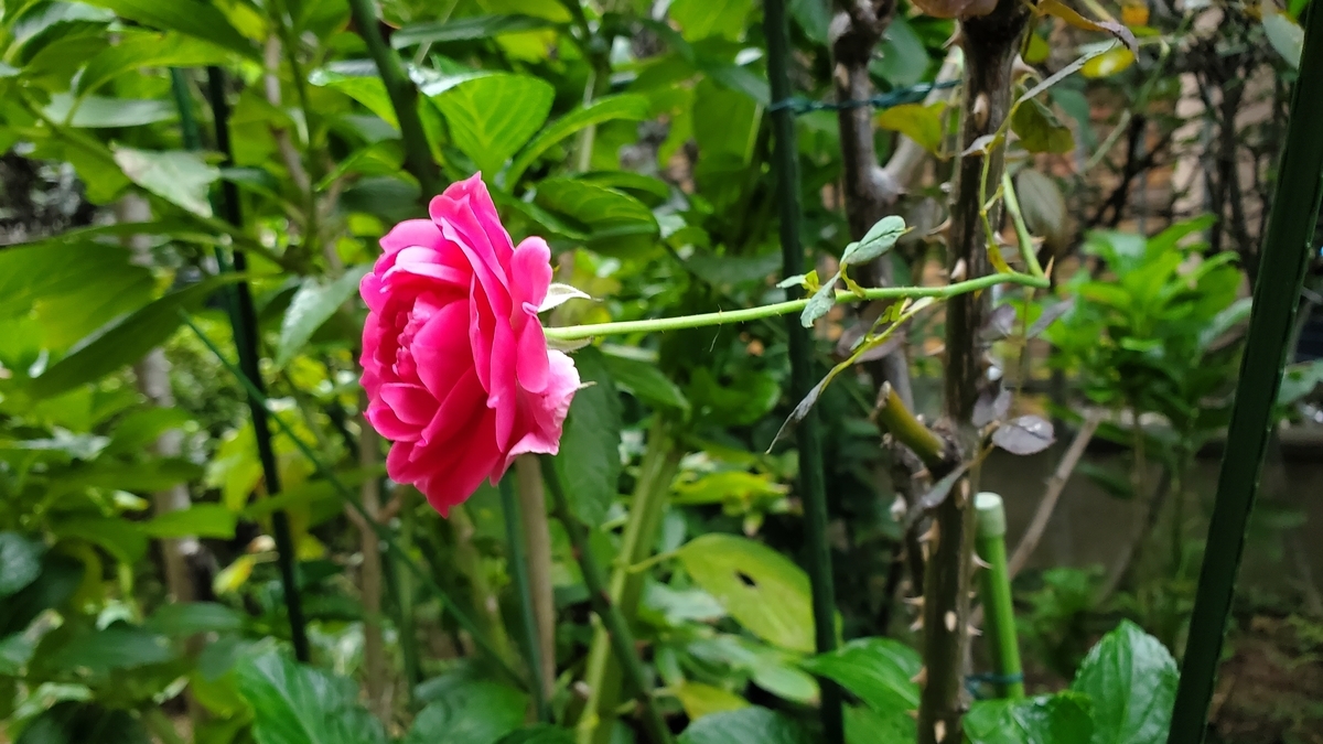 今朝、しっかり咲いていた。花の重さで、枝がしなっている。