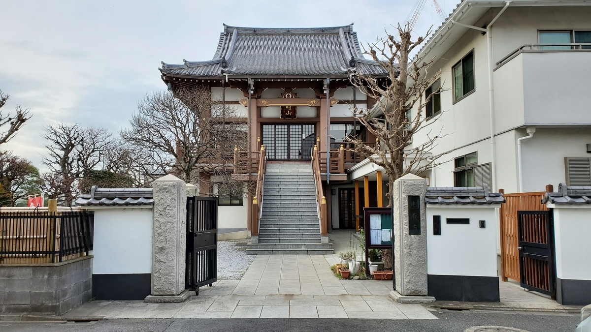 旧鎌倉街道沿いで、かつては近くの渡し舟のあたりには市場が立っていたそうで、旧地名は古市だった。(古市の名称は公園に残されていた。)詳細は不詳だが、鎌倉時代後期より、多摩川と岸辺に暮らす人々を見守り続けて600年のお寺とのこと。ご本尊は大悲胎蔵生大日如来。