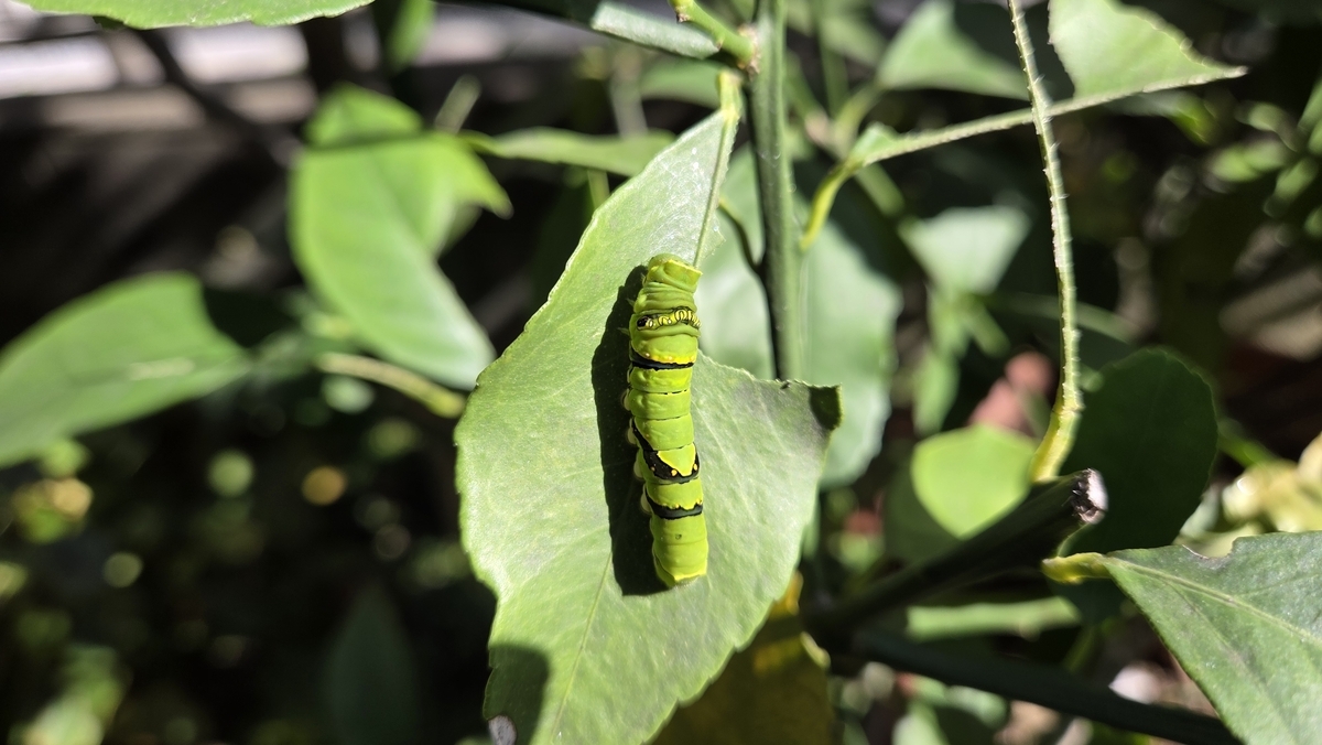 レモンの木でイモムシ三兄弟が誕生したのだが、11月8日に長男と次男が家出していた。その後2日ほど三男の姿はあったが、ある日 同じように見えなくなっていた。兄弟そろって家出をしたのだろうと思いながらも毎日探していたら、今日10時9分、姿があった。